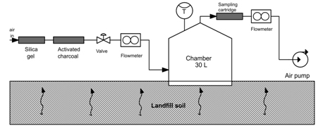 Volatile organic compound (VOCs) emissions from a landfill soil. Sampling with flow chamber method with later plume dispersion modeling and impact on tropospheric ozone formation