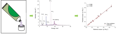 Figure shows the steps for determining TiO2 in toothpastes, after the calibration model is ready to be used. Figure translates associated aspects of the developed method as a green chemistry strategy, with minimal sample manipulation and high sample throughput
