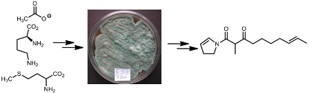 Feeding experiments using 13C-labeled precursors were performed aim at investigating the biosynthesis of two dihydropyrrole-polyketides isolated from a marine-derived Penicillium citrinum. The results showed that the biosynthesis proceeds from acetate, methionine and ornithine