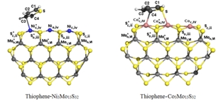 Thiophene adsorbed on NiMoS and CoMoS catalysts was studied with density functional theory and a topological approach to probe electronic modifications. The origin of the promoter effect, an enhancement of hydrodesulfurization activity due to weaking of metal-sulfur bond strengths, was explained