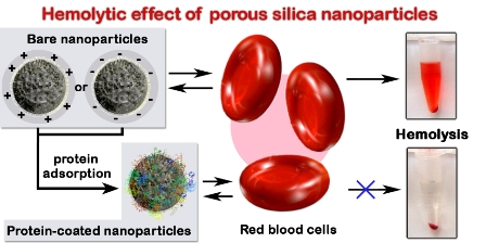 Bare porous silica nanoparticles induce hemolysis in human red blood cells, while protein coated nanoparticles resulted from their interaction with blood plasma (the so called protein corona effect) completely prevent the hemolytic effect