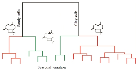 The chemical composition of copaiba oils (Copaifera multijuga Hayne) is affected by soil characteristics, but not seasonality or diameter at breast height (DBH). Cluster analysis shows that caryophyllene and its oxide form the main groups