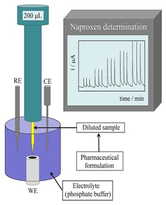 A fast method for naproxen determination in pharmaceutical formulations using batch injection analysis with pulsed amperometric detection is presented. High analytical frequency (90 h-1), satisfactory accuracy and low limit of detection (0.3 µmol L-1) were obtained