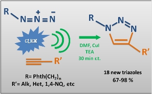 N-substituted phthalimidoalkyl 1H-1,2,3-triazoles were obtained in good-to-excellent yields (67-98%) through click chemistry protocol (Cu-AAC) at room temperature using DMF, Et3N under ultrasound irradiation