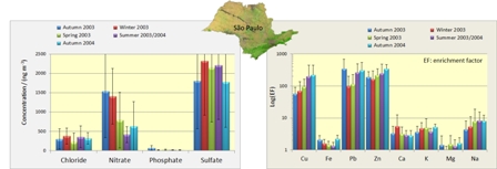 This work describes the seasonal distribution of important constituents of PM10 particles (particulate matter less than 10 μm in diameter; major ions and trace elements) in Sao Paulo Megacity, Brazil. Predominant sources were fuel burning, biomass burning, gas-to-particle conversion and sea salt spray