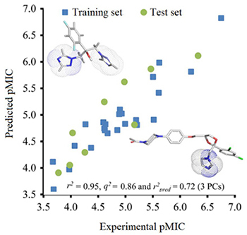 Classification and quantitative models were developed to determine which features are relevant to the antifungal activity of a series of 33 azole derivatives assayed against Cryptococcus gattii. From these models, electronic characteristics were highlighted as important for antifungal activity and targeted to structural changes in this series of compounds.