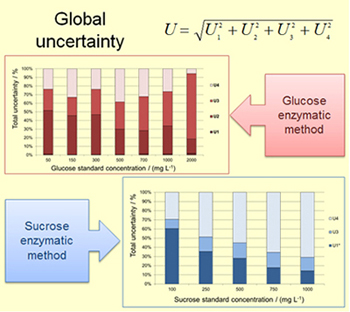 The global uncertainty (U) combines the contributions of all the sources of error linked to the analytical procedure. U1, U2, U3 and U4 are the uncertainties associated to standard preparation, calibration curve, precision and accuracy, respectively.