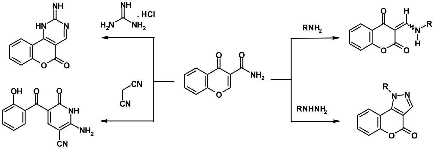 A variety of heterocyclic systems was obtained from ring transformation of chromone-3-carboxamide under nucleophilic conditions.