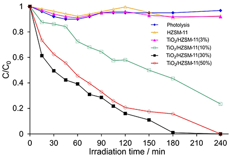 Chlorobenzoic acids are persistent pollutants in the environment, adversely affecting the flora and fauna. In this work, the photocatalytic decomposition of 2-, 3- and 4- chlorobenzoic acids with TiO2 loaded on HZSM-11 zeolite was investigated. We report the use of zeolite-supported TiO2, which can be easily removed and is a very efficient and reusable photocatalyst.