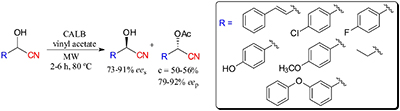 Enzymatic kinetic resolution (EKR) of (±)-cyanohydrins was performed by using immobilized lipase from Candida antarctica (CALB) under conventional ordinary conditions (orbital shaking) and under microwave radiation (MW). Under the latter experimental conditions, good performance and shorter reactions times were achieved.