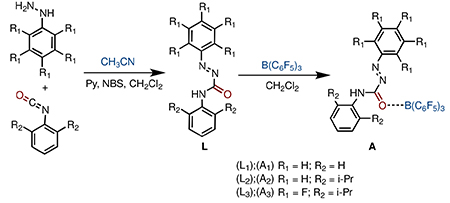 The synthesis and structure of new diazenecarboxamide ligands are described, as well as the subsequent reactions to give rise to new adducts in which B(C6F5)3 is coordinated to the carbonyl group. All new ligands and adducts are fully characterized by nuclear magnetic resonance (NMR), infrared (IR), elemental analysis and single-crystal X-ray diffraction methods.
