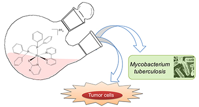Three new RuII complexes with pyrimidine-2-thiolate, bipy and varying the diphosphinic ligands were obtained. These compounds are promising agents against Mycobacterium tuberculosis and breast cancer cells, MDA-MB-231.