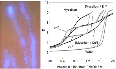 How to cite this articleFungal mycelium is a fundamental component of complex ecological networks with several symbiotic and dissipative properties on terrestrial biogeochemical matrix. The vast presence of mycelium is responsible for the control of chemical potential (e.g. pE and pH) of aqueous phase on soils, contributing to its response (buffering) capacity and the time controlling of physical-chemical conditions, as shown for the model of complex system S. Details are presented in the Article Equilibrium and Out-Of-Equilibrium Investigation of Proton Exchange and CuII and ZnII Complexation on Fungal Mycelium (Trametes hirsuta) by Vicente R. Almeida, Bruno Szpoganicz, Lei Chou, KittyBaert, Annick Hubin and Steeve Bonneville on page 15.