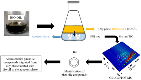 Bio-oil contains promising compounds, such as phenolic compounds, active in the control of microbiological contamination during fuel storage. The figure shows that through two-dimensional gas chromatography with time-of-flight mass spectrometry (GC×GC/TOF MS) we identified these phenolic compounds.