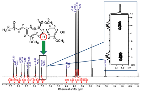 The use of two-dimensional (2D) nuclear magnetic resonance (NMR) spectroscopy techniques for the unequivocal assignment of the 1H and 13C NMR data of two synthetic dihydrobenzofuran neolignans.