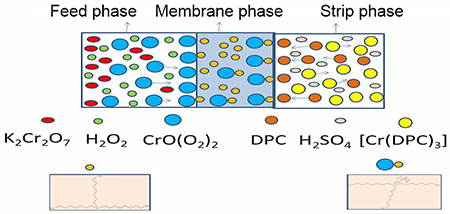 The supported liquid membrane (SLM) design for CrVI extraction shows the transport mechanism of Cr ions in the form of [CrO(O2)2.TOPO] (TOPO = trioctylphosphine oxide) complex from feed to strip phase through membrane phase.
