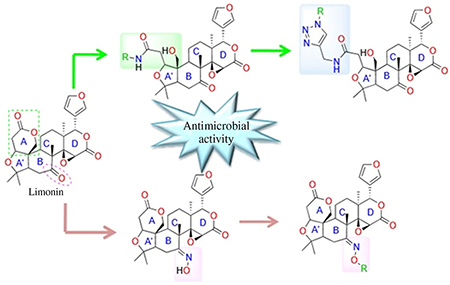 A novel series of derivatives was synthesized from limonin using methodology in solution as well as in heterogeneous medium. The present study generated compounds that showed important antimicrobial activity.