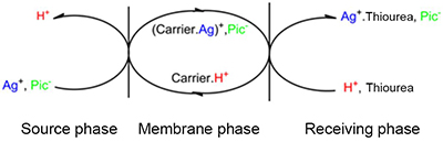 Liquid membrane system for transport of Ag+ ions using 1,1'-(1,3-phenylene) bis (3-allylthiourea) as a carrier.