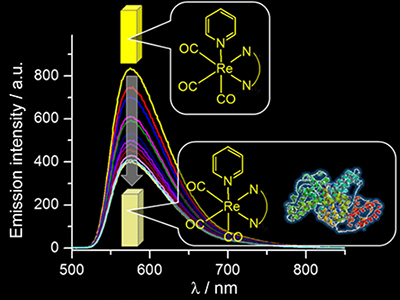 The photophysical investigations showed that in the presence of bovine serum albumin (BSA), the metal-to-ligand-charge transfer (3MLCT) emission of the rhenium(I) complexes was quenched due to entrapment of the complex within the protein environment.