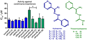 Isoniazid-derived hydrazones are the most cytotoxic compounds, whereas the thiosemicarbazones are more selective against L. braziliensis strains.