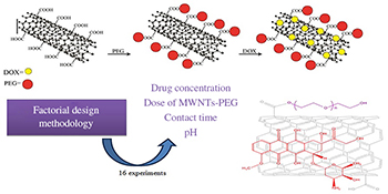 Adsorption potential of functionalized multi walled carbon nanotubes (MWNTs) studied in Doxorubicin in water model system. Significant factors were evaluated using 24 full factorial design. Thermodynamic and kinetic parameters were also studied.