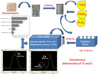 The optimized analytical method was efficient, specific and selective for simultaneous determination of Th and U by inductively coupled plasma optical emission spectrometry (ICP OES) in mineral fertilizers.