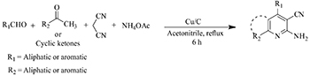In the present work, novel procedure for synthesis of 2-amino-3-cyanopyridine derivatives has been reported by using copper nanoparticles on charcoal (Cu/C) as heterogeneous catalyst.