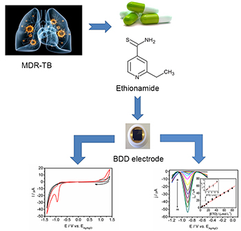 The ethionamide has been used in the treatment of drug-resistance tuberculosis (MDR-TB) and its quantification in pharmaceuticals and urine by square wave voltammetry boron-doped diamond electrode (SWV-BDDE) has been shown.