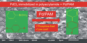 Pd/polyacrylamide (PAM) proved to be an efficient catalyst for Suzuki-Miyaura cross-coupling of ArI and ArBr in eco-friendly conditions.