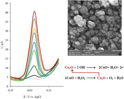 Chemically activated pencil graphite electrode modified with CuO nanocubes presented as electrochemical H2O2 sensor. The presented sensor has excellent electrocatalytic activity toward H2O2 oxidation (dramatically decrease in H2O2 oxidation overpotential, at about +0.05 V vs. Ag/AgCl).