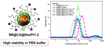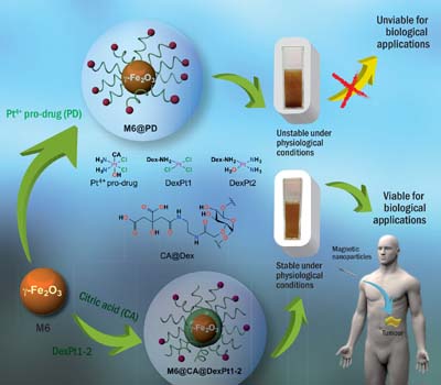 In this paper we describe synthetic strategies for improving the colloidal properties of platinum drug-functionalized superparamagnetic iron oxide nanoparticles (SPIONS). Protecting the surface of SPIONS with citric acid and further functionalization with Pt2+ complexes modified dextran is an excellent tactic to obtain stable magnetic nanoparticles under physiological conditions. Details are presented in the Article Studies of the Colloidal Properties of Superparamagnetic Iron Oxide Nanoparticles Functionalized with Platinum Complexes in Aqueous and PBS Buffer Media by Gustavo B. da Silva, Marzia Marciello, María del Puerto Morales, Carlos J. Serna, Maria D. Vargas, Célia M. Ronconi and Rocío Costo on page 731.