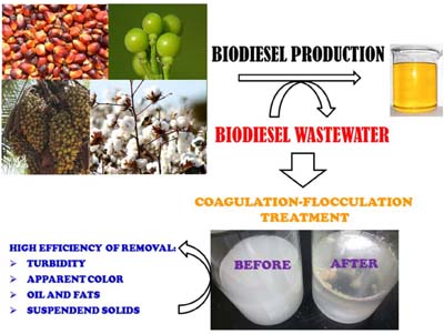 A coagulation-flocculation process was evaluated as alternative for treatment of biodiesel wastewater, being obtained efficiencies between 82 and 99% for removal of apparent color, oils and fats, turbidity and suspended solids.