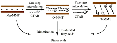 After one-step and two-step intercalations, the structure and properties of montmorillonite (MMT) affect the formation of dimer acids by the dimerization of unsaturated fatty acids.