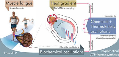 Transition between chemical and thermokinetic oscillations mediated by a stoichiometric bifurcation parameter in a hypothetical biological context: muscle fatigue and possible ATP thermosynthesis.
