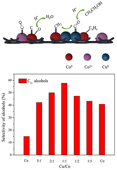 Copper promotes the reduction of CoO and forms Cu0–Co0 active sites; in addition to this center, Co0–Co2+ is also the center for high alcohols synthesis and Co2+ site favor alcohols yields. Excellent C2+ alcohols selectivity is got over the catalyst with weight ratio of Cu/Co = 1.