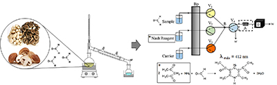 A multicommuted flow system for spectrophotometric determination of formaldehyde in mushroom based on the Hantzsch reaction (λmax = 412 nm) is reported with a detection limit of 0.02 mg L-1, sample throughput of 17 h-1 and reduced chemical waste.