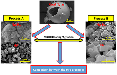 Comparison between the two processes via: (i) assessment of the process of Si, Al and contaminants in the extracts, zeolitic, products and effluents, (ii) cation exchange capacity and purity, and (iii) reaction yields and percentage of Si and Al incorporated into zeolites, among others.
