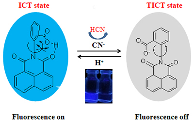 A water soluble fluorescent chemosensor (DA) was successfully synthesized. It could fluorescent detect CN- with high selectivity and sensitivity in pure water via an intramolecular charge transfer to twisted intramolecular charge transfer (ICT-TICT) state change mechanism.