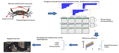 Graphical abstract shows the three studied tissues, the sequence of scientific work with relation to the investigation on single condition to prepare samples, analytical features, validation of analytical procedure and application.
