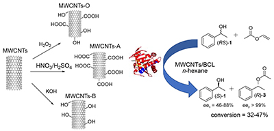 The systems Burkholderia cepacia lipase (BCL) on pristine or functionalized multi-walled carbon nanotubes (MWCNTs) resulted in a 3-fold improvement in the conversion and in a 5-fold improvement in ees (enantiomeric excess of the substrate), when compared with free BCL. The support was reused for eight cycles. An increase in the thermal stability of BCL was confirmed by thermogravimetric analysis (TGA).