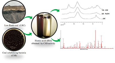 The characterization of humic acid (HA) obtained by activity of bacterial strains, that transform a low rank coal (LRC) lignite type and release humified organic matter (HOM), was compared with HA obtained by the traditional alkaline extraction method using 0.5 M NaOH (HA-NaOH).