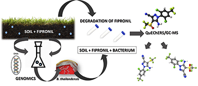 A QuEChERS/GC-MS method was essential to quantitate the biological degradation of fipronil in soil fertilized with humic substances. We isolated more than two-dozens of microorganisms from such soil, and the most abundant, Burkholderia thailandensis, showed the capability to degrade fipronil into active metabolites.