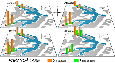 This work shows the distribution of selected micropollutants in Paranoá Lake that receives effluents from the capital of Brazil and will be used to produce drinking water in order to avoid water scarcity. Source and drinking waters were also investigated.