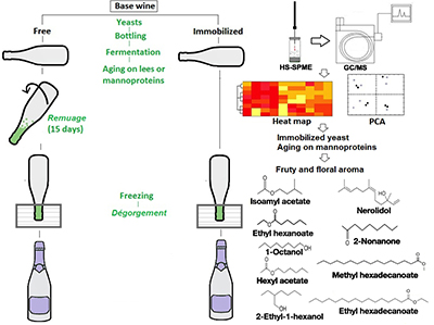 The use of immobilized yeasts and aging on mannoproteins or lees seemed to be a promising treatment to achieve positive aroma notes in the volatile profile of sparkling wines.