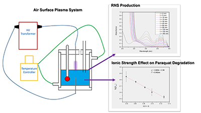 The graphical abstract schematically shows the surface air plasma setup for aqueous paraquat degradation. The production of reactive nitrogen species (RNS) and the ionic strength effect on paraquat degradations are shown in detail on the graphs.