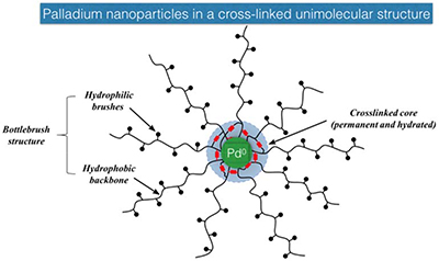 Well-defined cross-linked polymeric structures behaving as highly hydrated unimolecular objects (polymer nanogels) are suitable capping agents for palladium nanoparticle catalyst systems. This structurally complex catalyst composite can be prepared in two-steps.