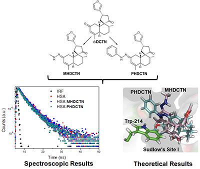 The interaction between human serum albumin (HSA) and semi-synthetic clerodanes showing potential anti-cancer activity was evaluated by experimental and theoretical methods. The clerodanes derived from trans-dehydrocrotonin (t-DCTN), methyl-hydrazone (MHDCTN) and phenyl-hydrazone (PHDCTN), showed better binding ability than the natural product t-DCTN.