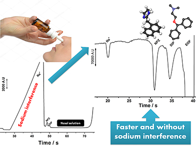 This work presents a simple and low-cost capillary electrophoresis (CE) method for ultra-fast (< 1 min) simultaneous determination of naphazoline in the presence of diphenhydramine or pheniramine or chlorpheniramine.