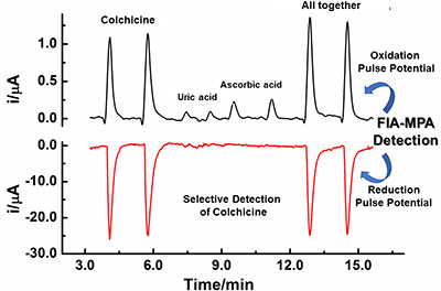 Selective, simple and fast determination of colchicine by multiple pulse amperometry coupled to flow injection analysis (FIA-MPA) system in pharmaceutical formulations and urine samples using a boron-doped diamond electrode.