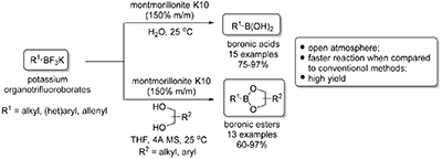 An efficient and non-expensive method for conversion of diverse potassium organotrifluoroborates to their corresponding boronic acids and boronic esters promoted by montmorillonite K10 using water as the reaction solvent is described.